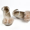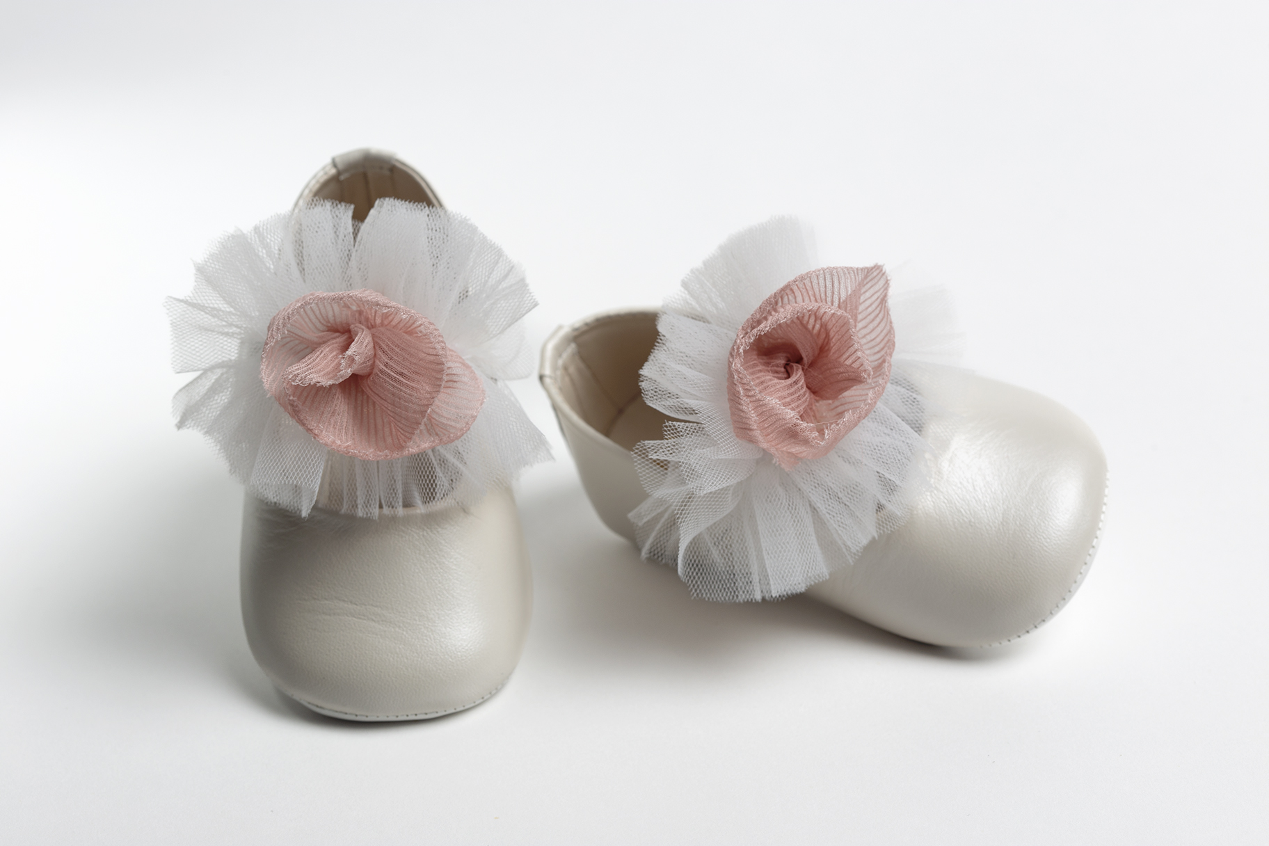 Μπαλαρίνα πρώτα βήματα από εκρού δέρμα και διακόσμηση με dusty pink μουσελίνα και off white τούλι.