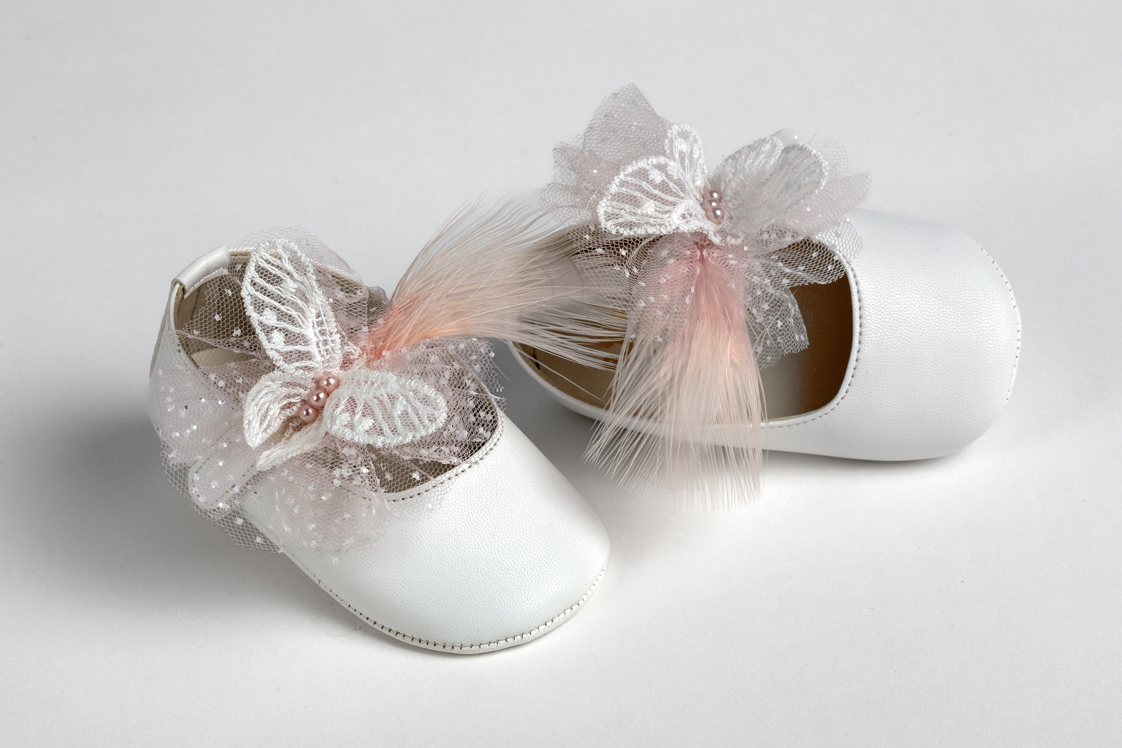 Μπαλαρίνα αγκαλιάς σε λευκό τεχνόδερμα, διακοσμημένη με τούλι, φτερό και πεταλούδα από δαντέλα everkid Κ518Α.
