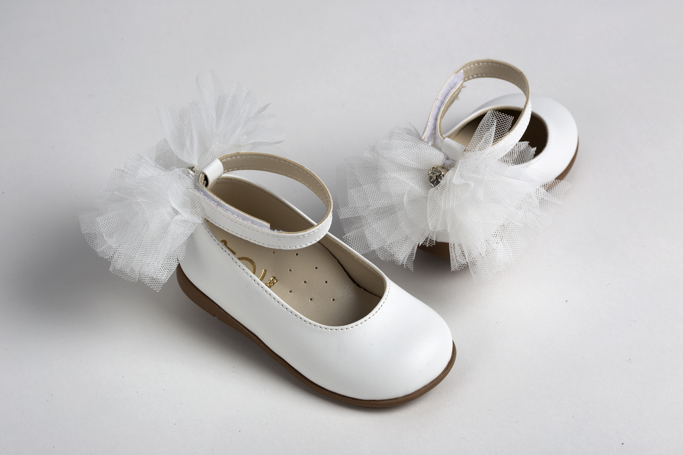 Μπαλαρίνα περπατήματος σε λευκό τεχνόδερμα με τούλινη διακόσμηση και κουμπί στρας everkid Κ562Α.
