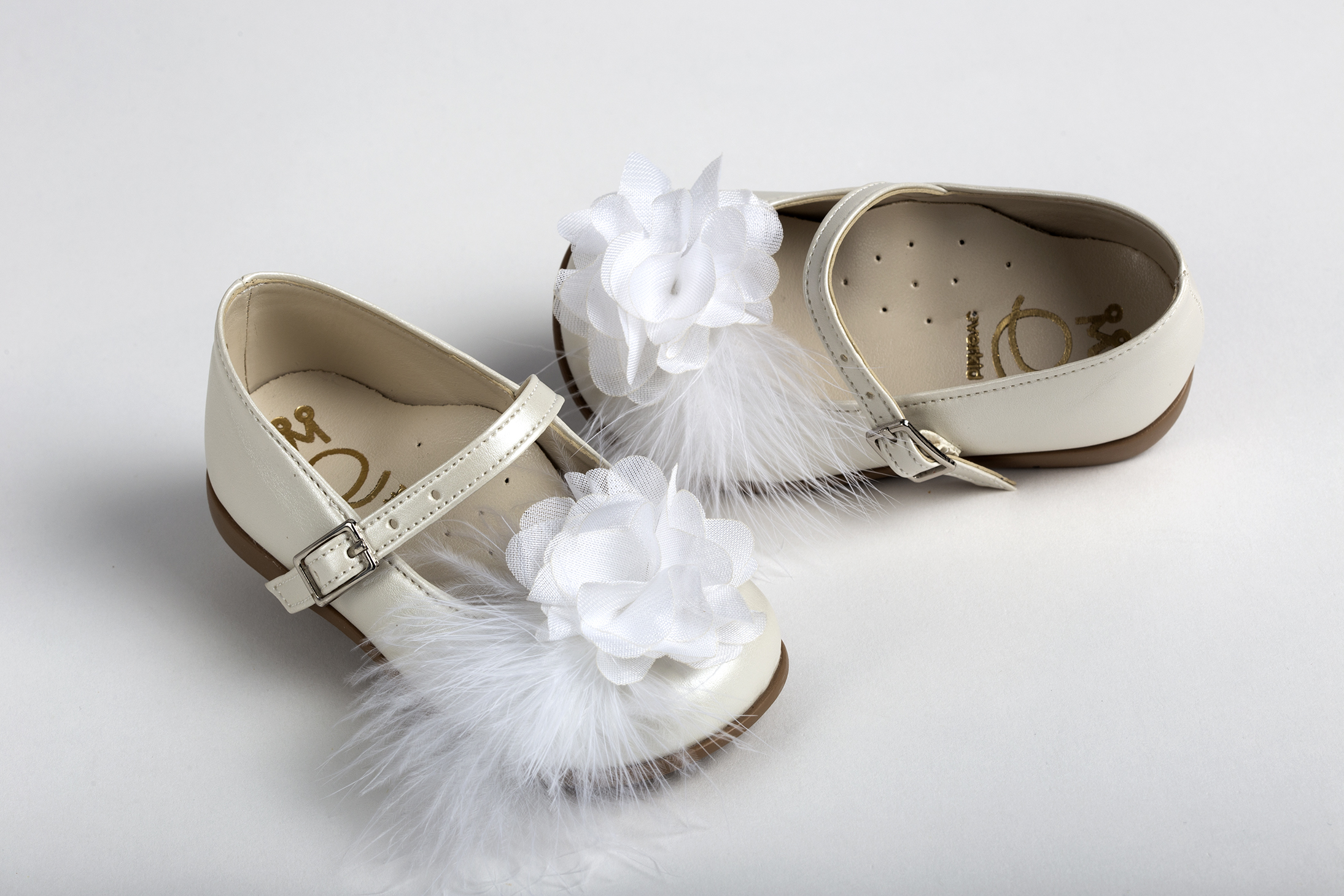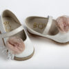 Μπαλαρίνα περπατήματος σε εκρού τεχνόδερμα διακοσμημένη με λουλούδι και φτερό σε λευκό everkid K564Ε.