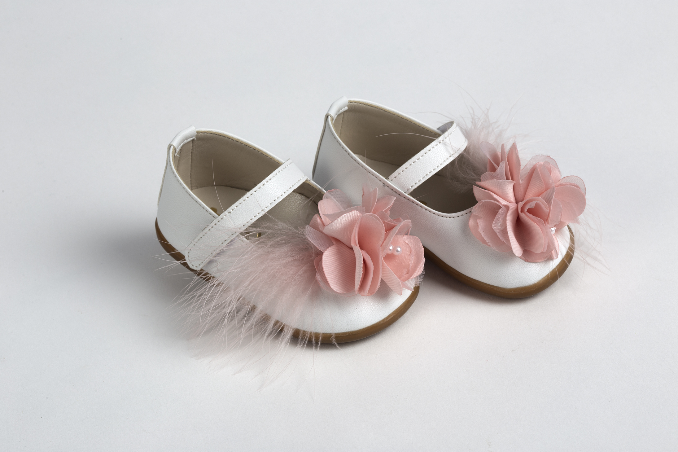 Μπαλαρίνα για τα πρώτα βήματα σε λευκό τεχνόδερμα διακοσμημένη με λουλούδι και φτερό σε dusty pink everkid Κ534Α .