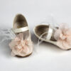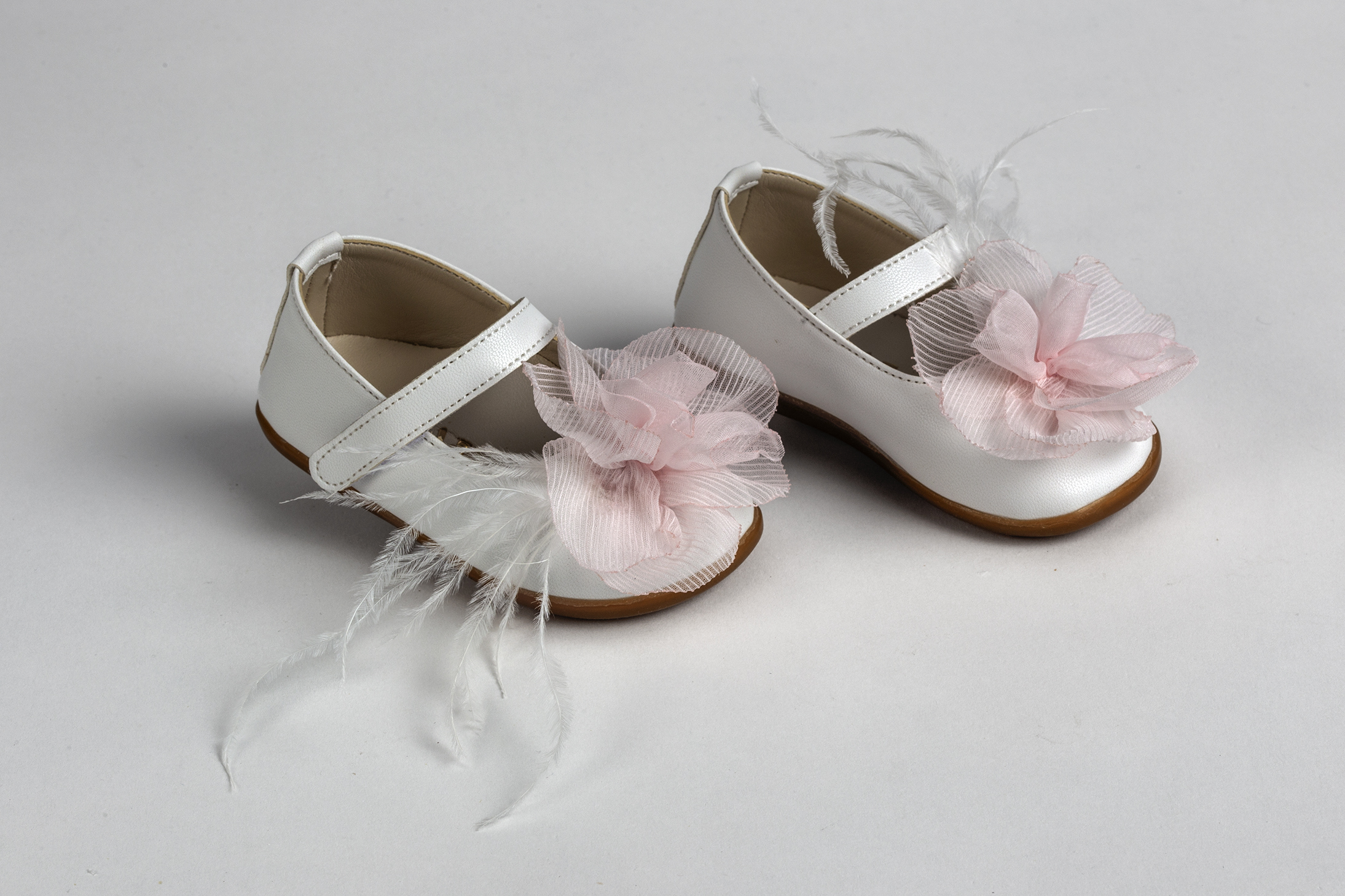 Μπαλαρίνα για τα πρώτα βήματα σε λευκό τεχνόδερμα διακοσμημένη με ροζ τούλινο λουλούδι και φτερό everkid Κ535Α .