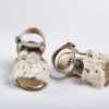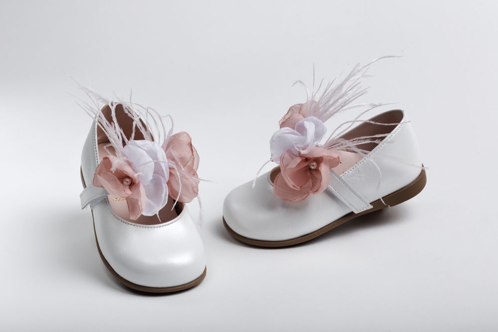 Μπαλαρίνα περπατήματος από εκρού δέρμα , διακοσμημένη με λουλούδια από dusty pink και εκρού μουσελίνα, πέρλες και φτερά, κλείσιμο με Velcro.