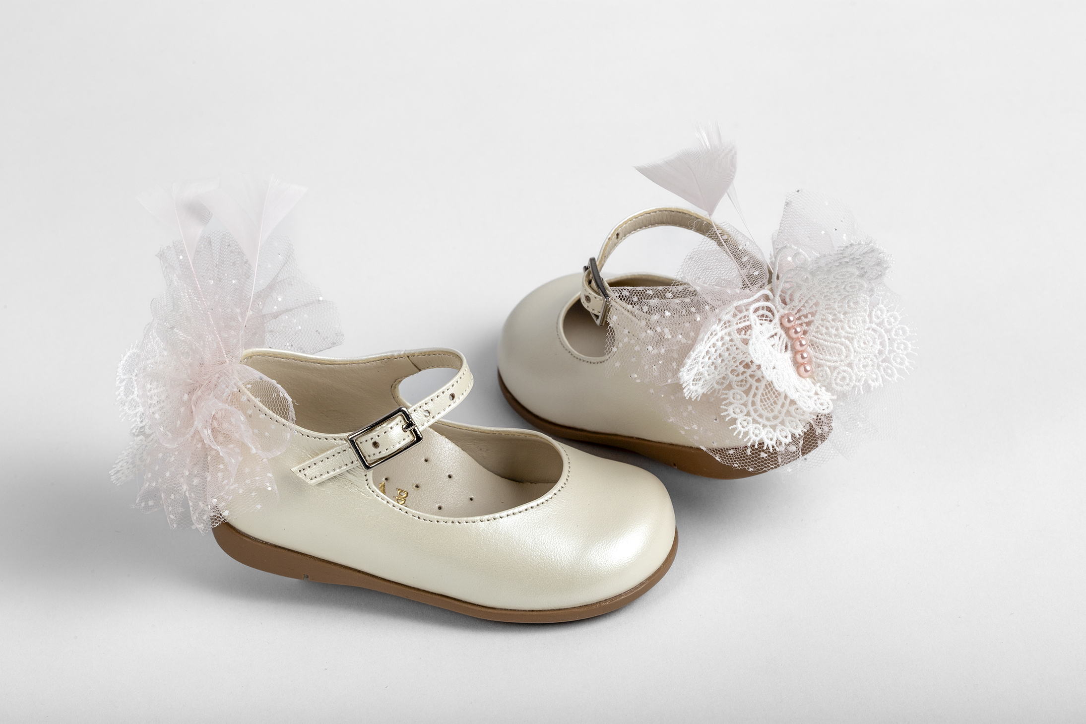 Μπαλαρίνα περπατήματος σε εκρού δέρμα διακοσμημένη με ροζ τούλι, φτερό και λευκή πεταλούδα από δαντέλα everkid Κ573Ε.