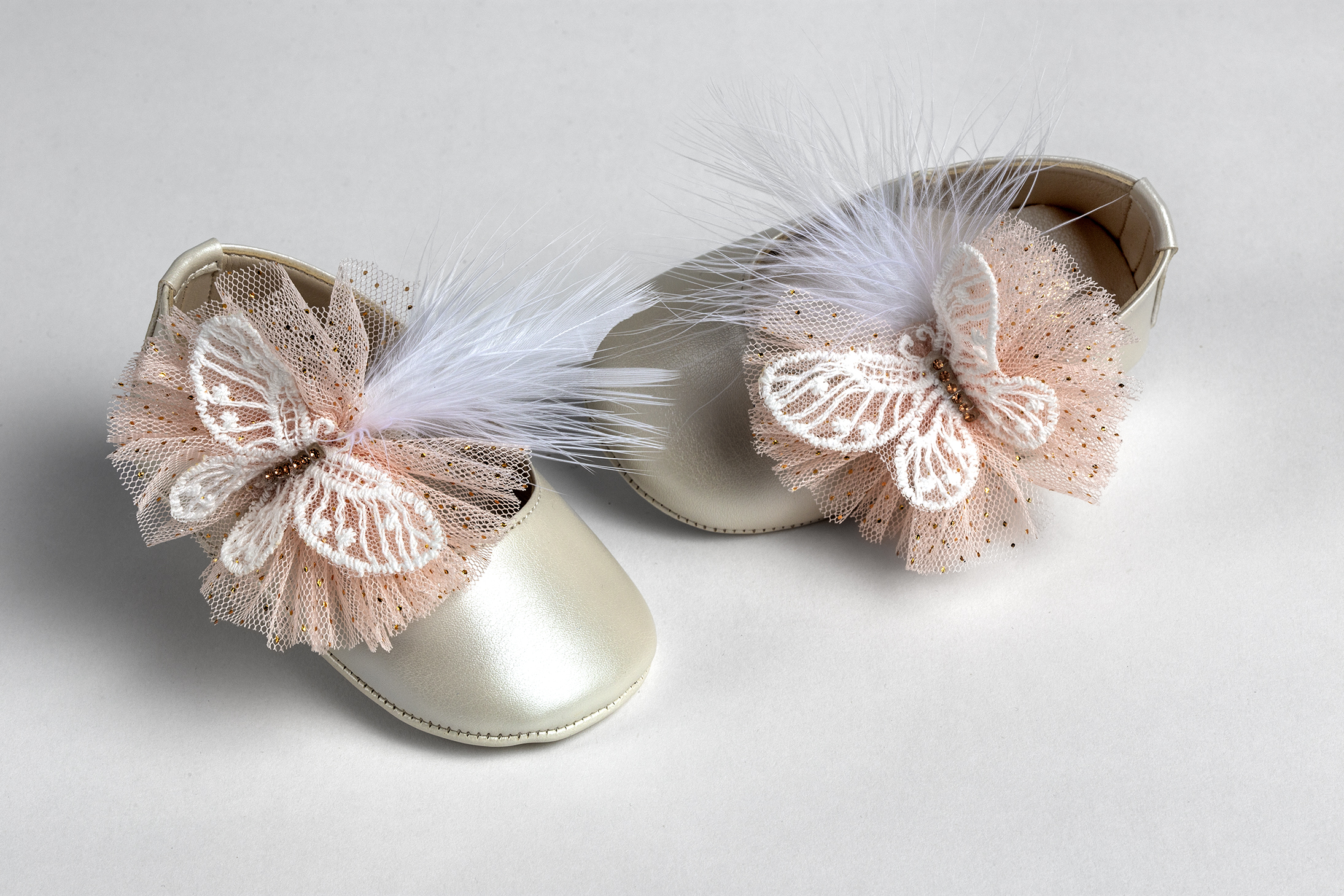 Μπαλαρίνα αγκαλιάς σε εκρού τεχνόδερμα διακοσμημένη με τούλι, φτερό και πεταλούδα από δαντέλα everkid Κ518Ρ.
