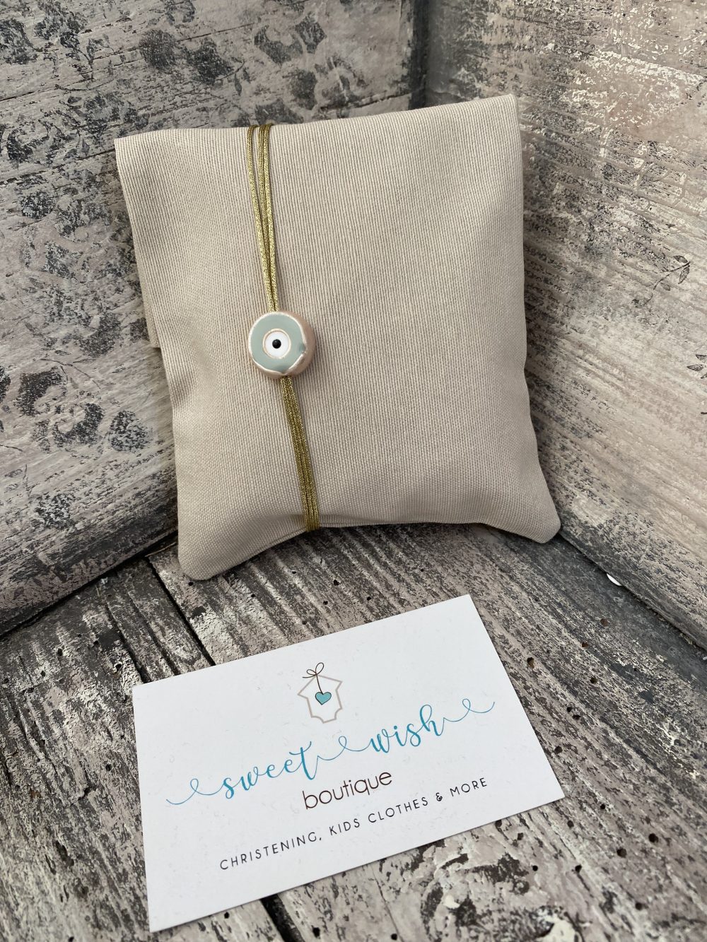 Μπομπονιέρα γάμου-βάπτισης σε πουγκί διπλωμένο φάκελο στο χρώμα της άμμου, χρυσό δέσιμο και κεραμικό ματάκι.