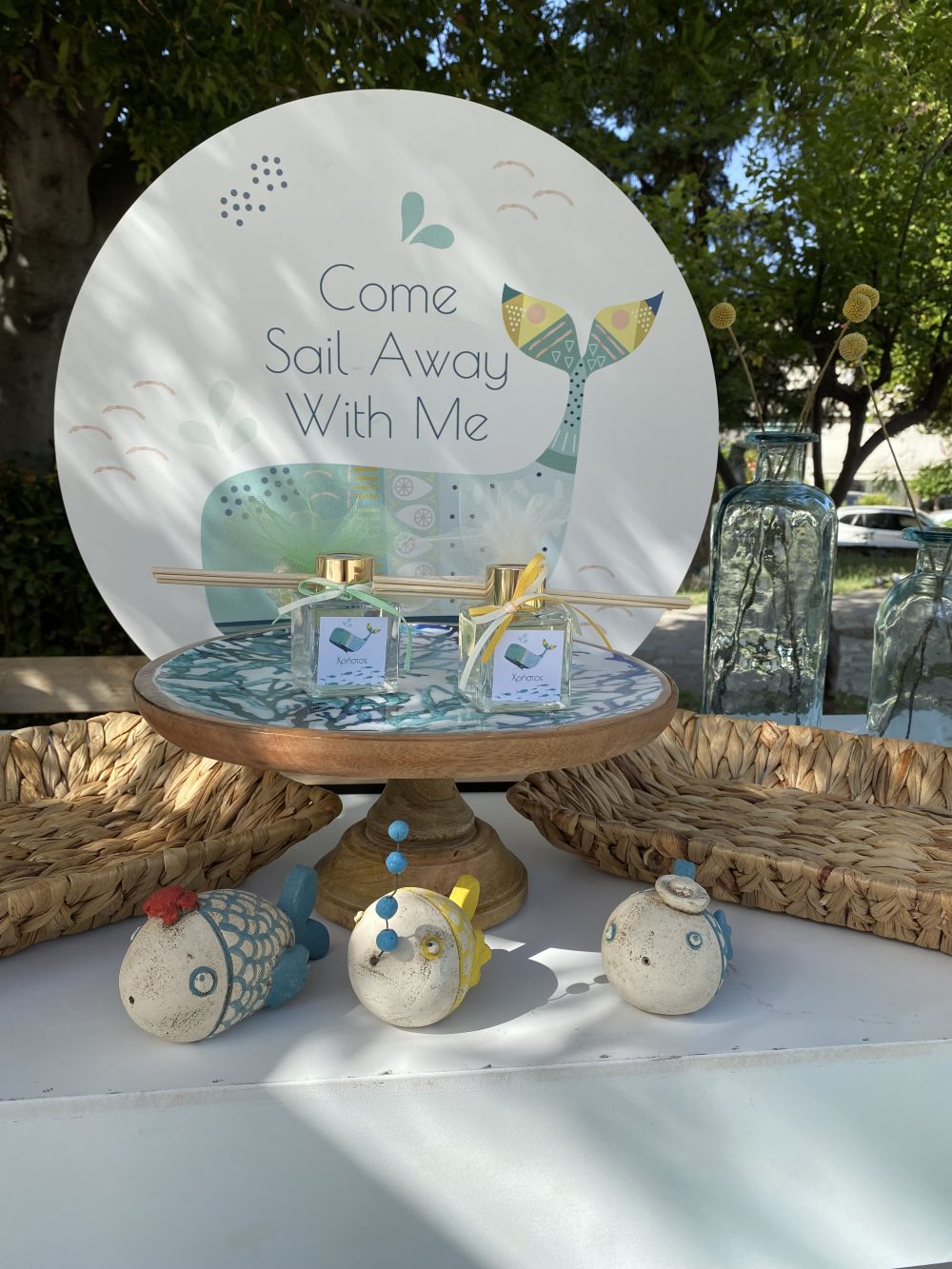 Μπομπονιέρα βάπτισης αρωματικό χώρου σε βαζάκι 50ml με θέμα φάλαινα.