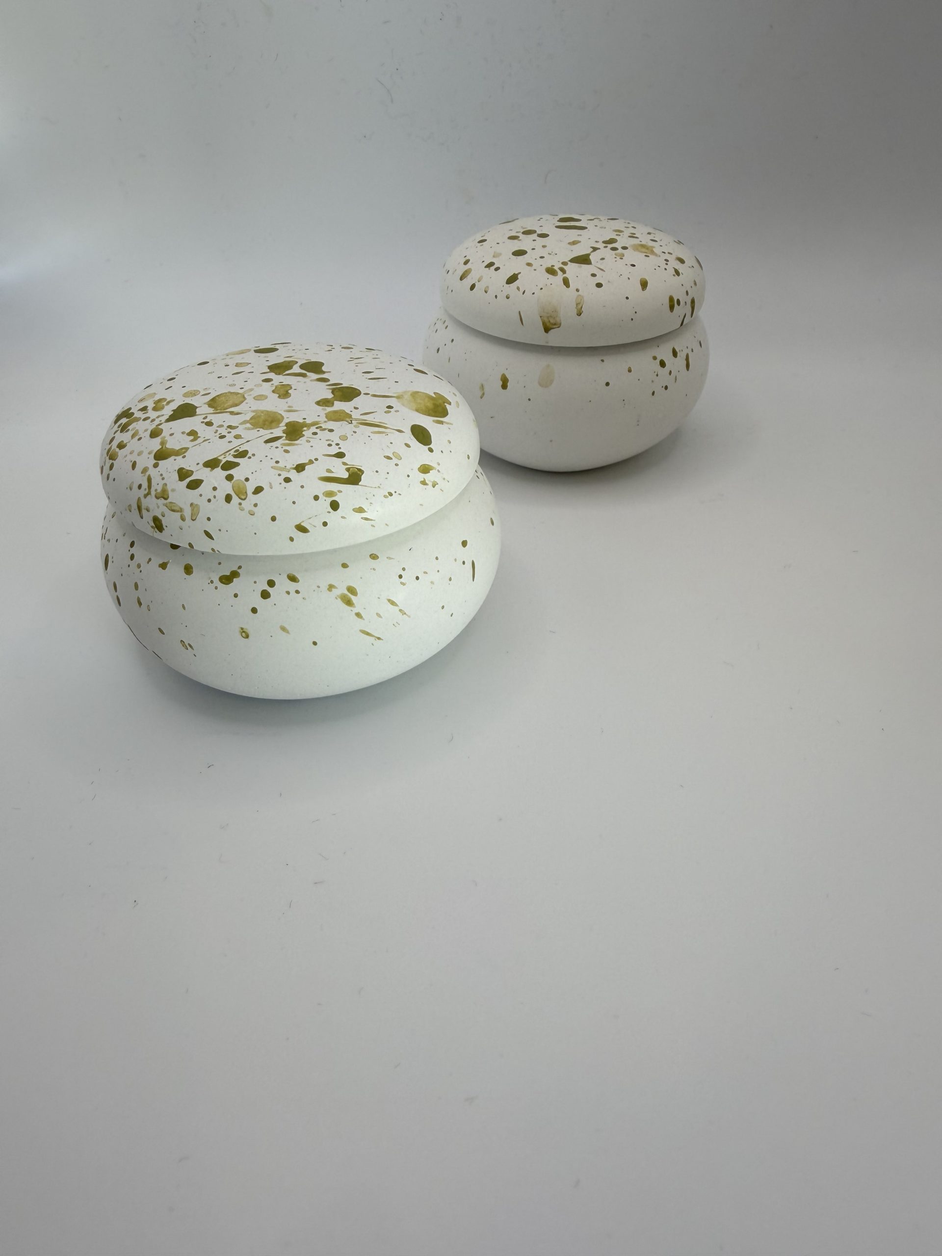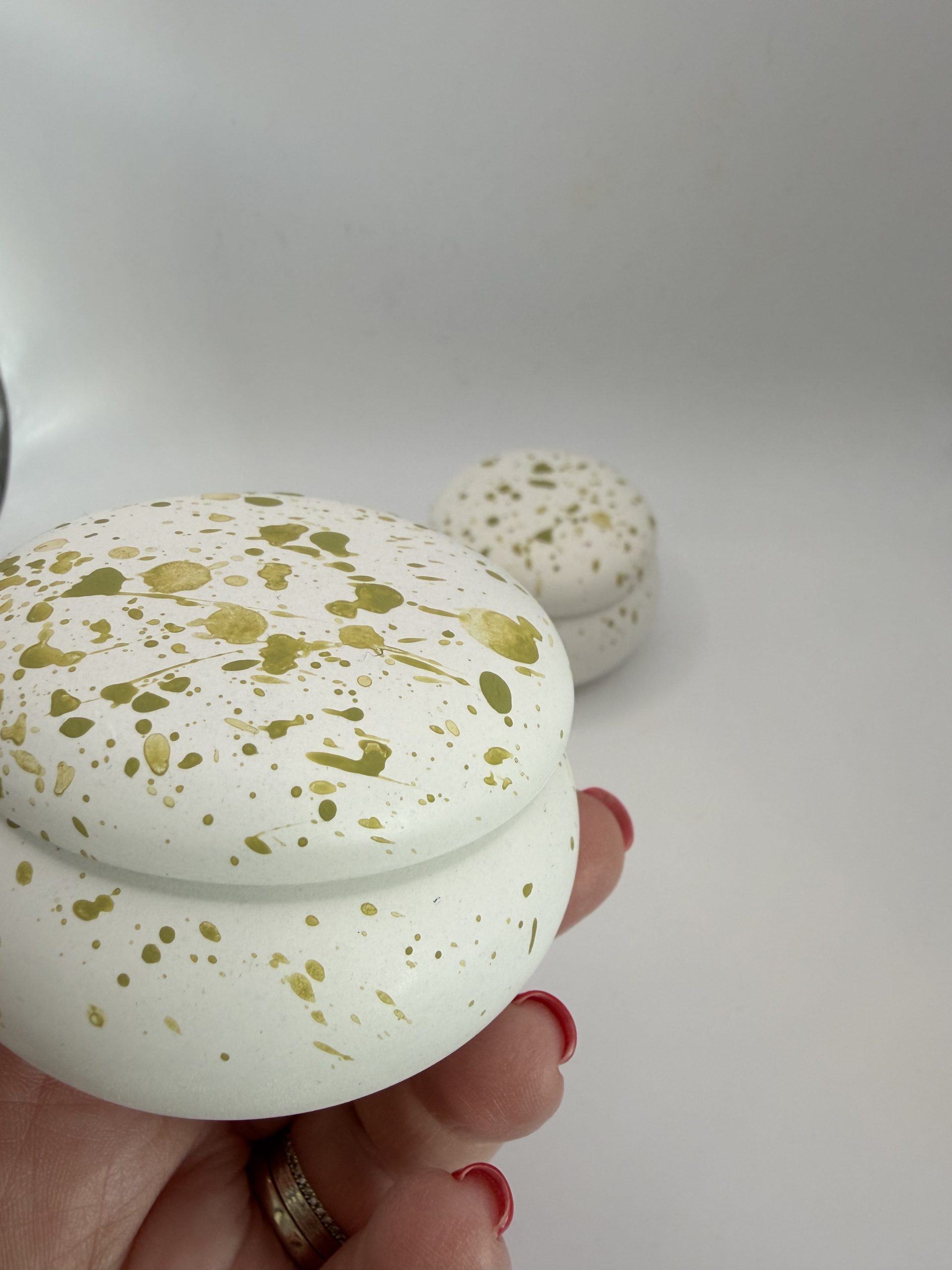 Κομψή μπομπονιέρα βάπτισης πορσελάνινη σε σχήμα μακαρόν, που λειτουργεί και ως πρακτική μπιζουτιέρα. Σε λαδί αποχρώσεις, με χώρο για κουφέτα.