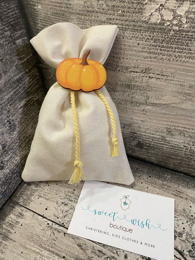 Μπομπονιέρα βάπτισης με με ξύλινο μαγνήτη και θέμα κολοκύθα.