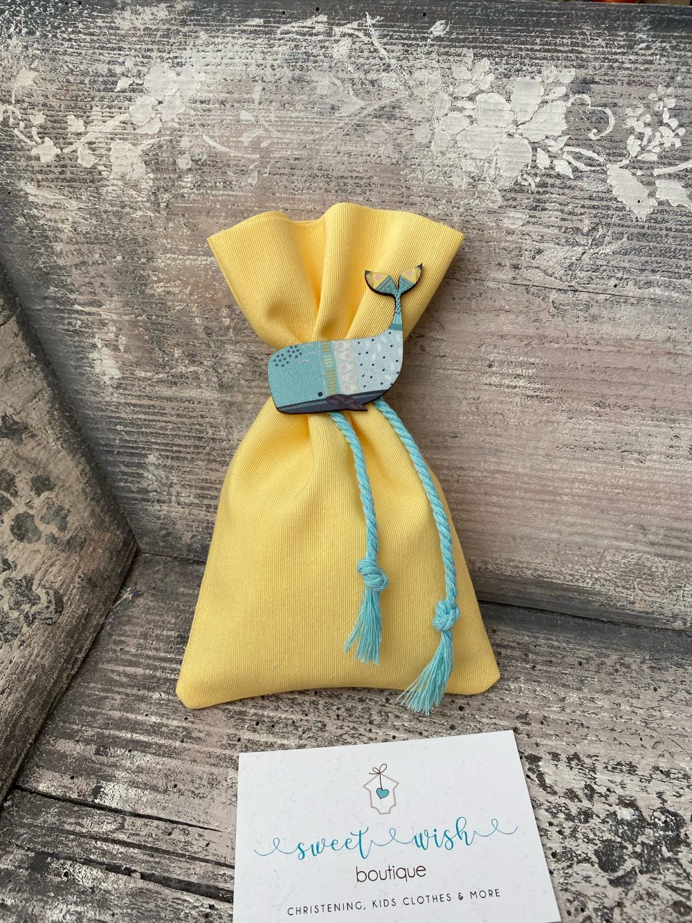 Μπομπονιέρα βάπτισης πουγκί σε κίτρινο χρώμα, στριφτό βεραμάν κορδόνι και ξύλινο διακοσμητική φάλαινα.