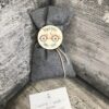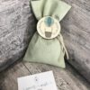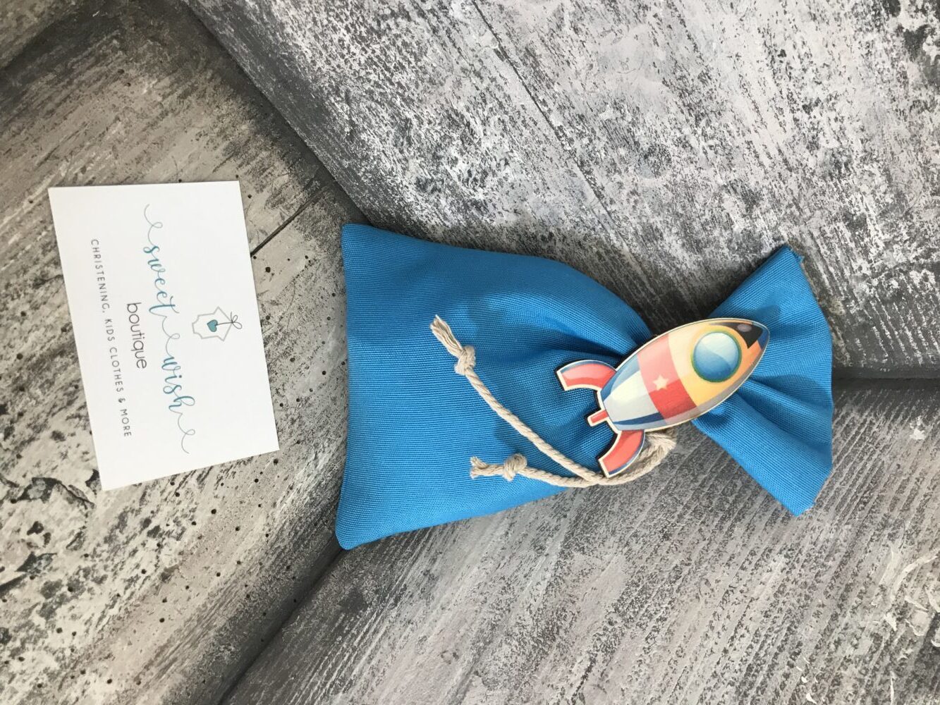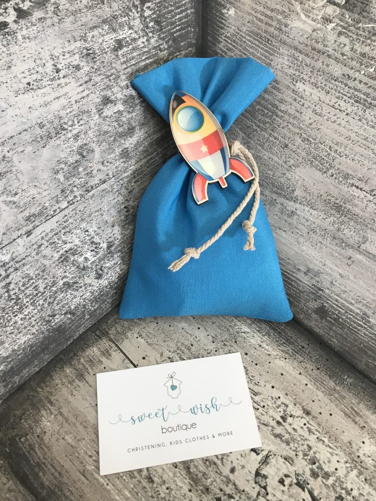 Μπομπονιέρα βάπτισης με υφασμάτινο βαμβακερό πουγκάκι σε μπλέ χρώμα, μπεζ στριφτό κορδελάκι και ξύλινο διακοσμητικό πύραυλο με μαγνητάκι.