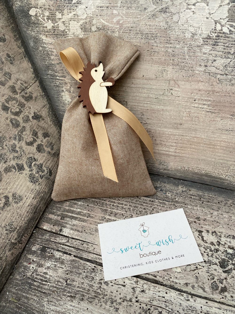Μπομπονιέρα βάπτισης πουγκί σε καφέ χρώμα με ξύλινο διακοσμητικό σκαντζόχοιρο και δέσιμο από μπεζ γκρο κορδελάκι.