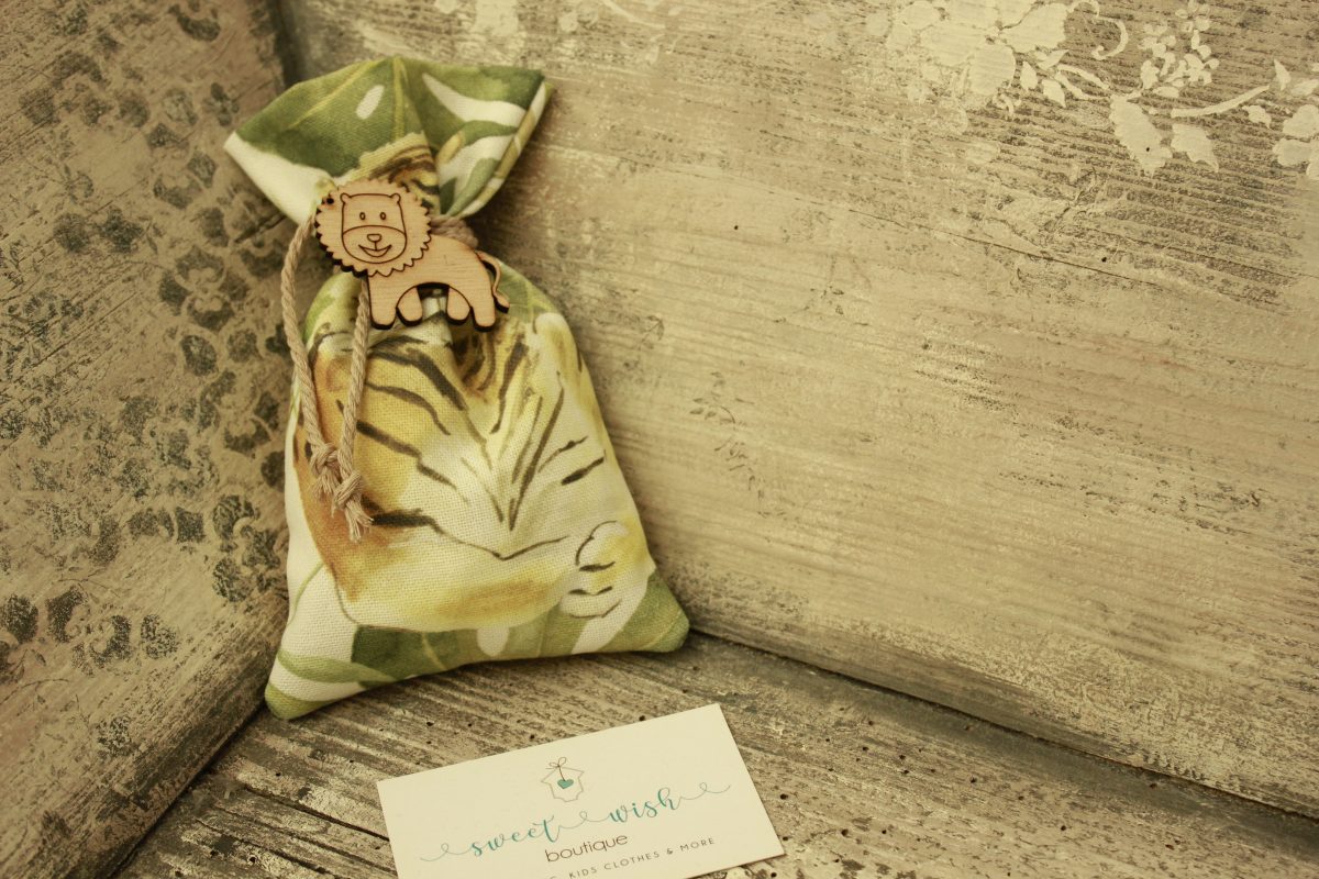 Μπομπονιέρα βάπτισης πουγκάκι με ψηφιακή εκτύπωση με θέμα ζωάκι της ζούγκλας και ξύλινο διακοσμητικό λιονταράκι.