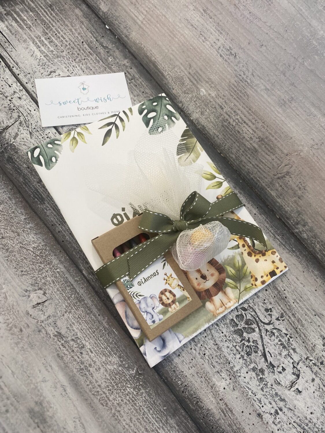 Παιδική μπομπονιέρα βάπτισης με θέμα ζωάκια της ζούγκλας με τετράδιο και κηρομπογιές.