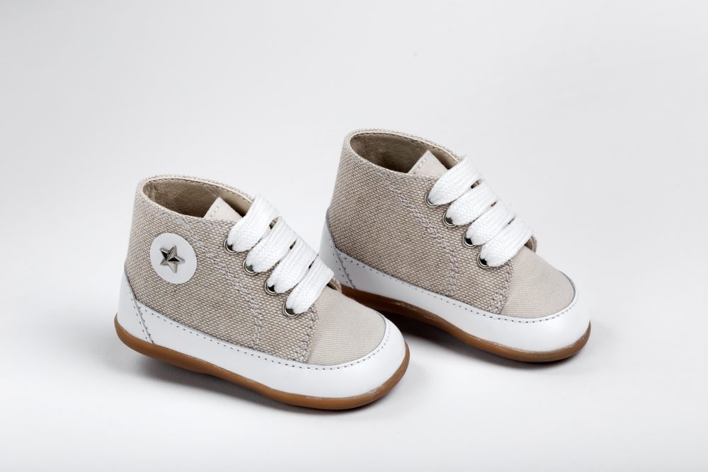 Μποτάκι δετό για τα πρώτα βήματα σε συνδυασμό μπεζ με εκρού ύφασμα.