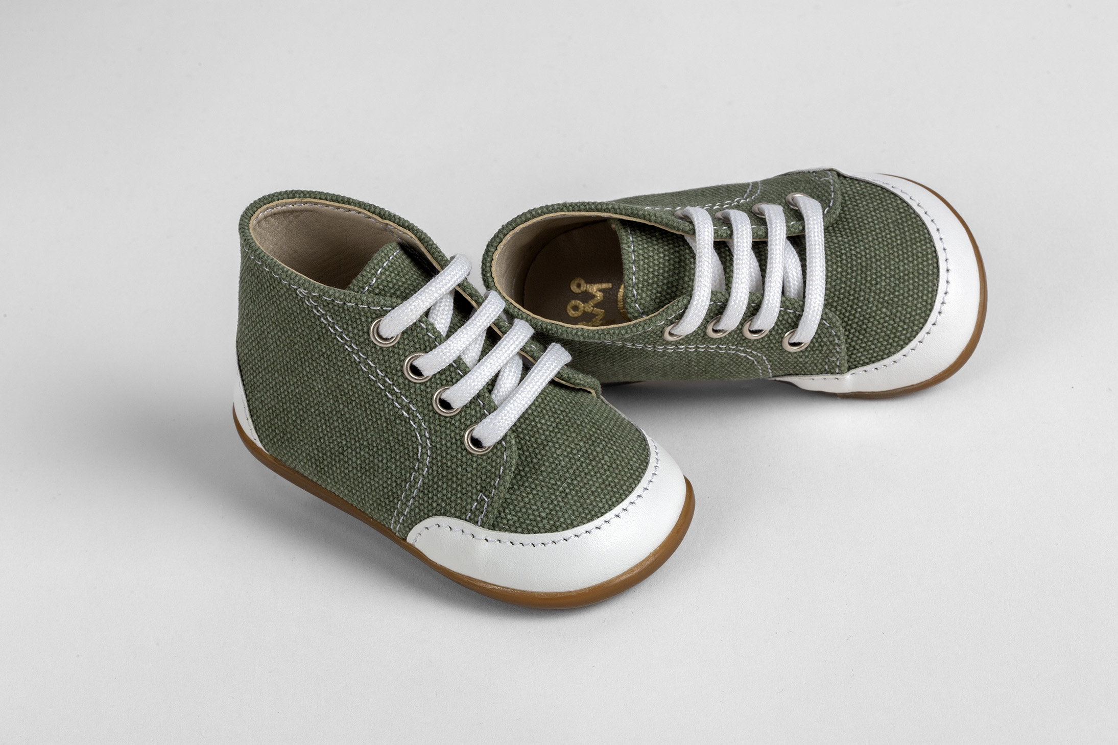 Μποτάκι για τα πρώτα βήματα σε λευκό δέρμα και λαδί καμβά everkid Α526Β.