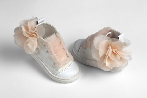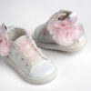 Μποτάκι περπατήματος σε λευκό δέρμα και λευκό καμβά, διακοσμημένο με ροζ λουλούδι everkid K581P.