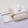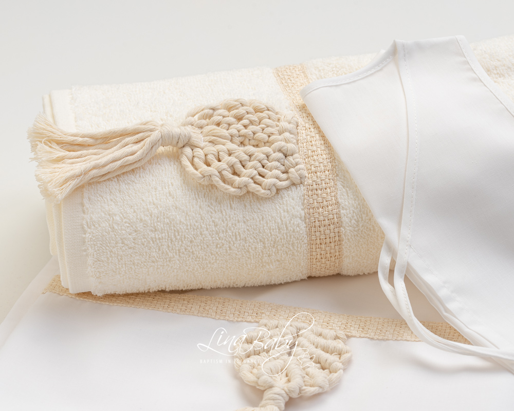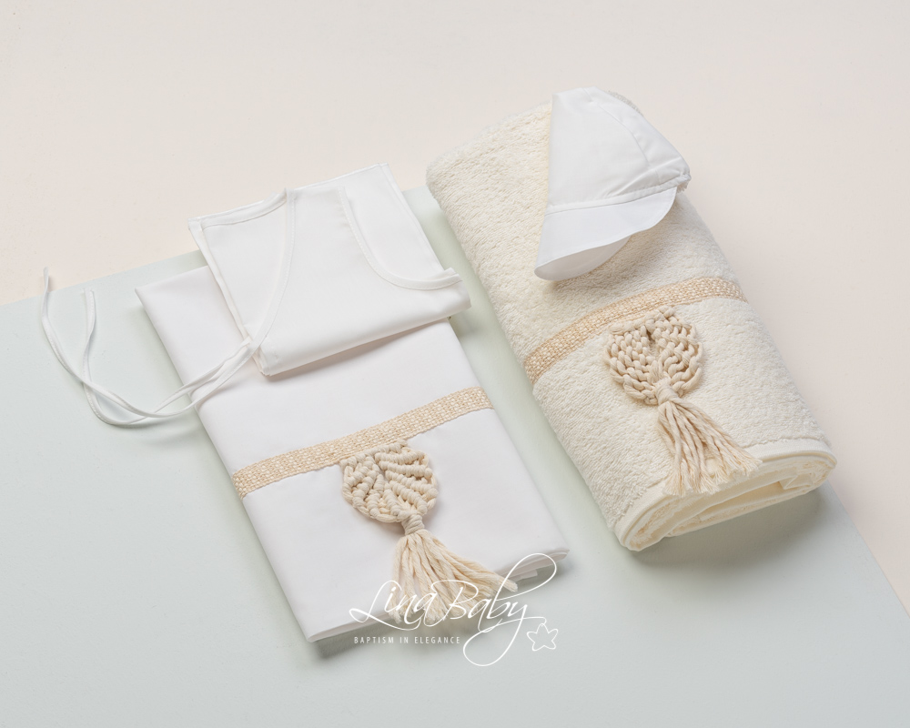Βαμβακερό σετ λαδόπανου σε εκρού χρώμα με ιβουάρ τρέσα και μακραμέ χειροποίητο διακοσμητικό σχέδιο.Πετσέτα 70*140*360g. OEKO-TEX STANDARD 100