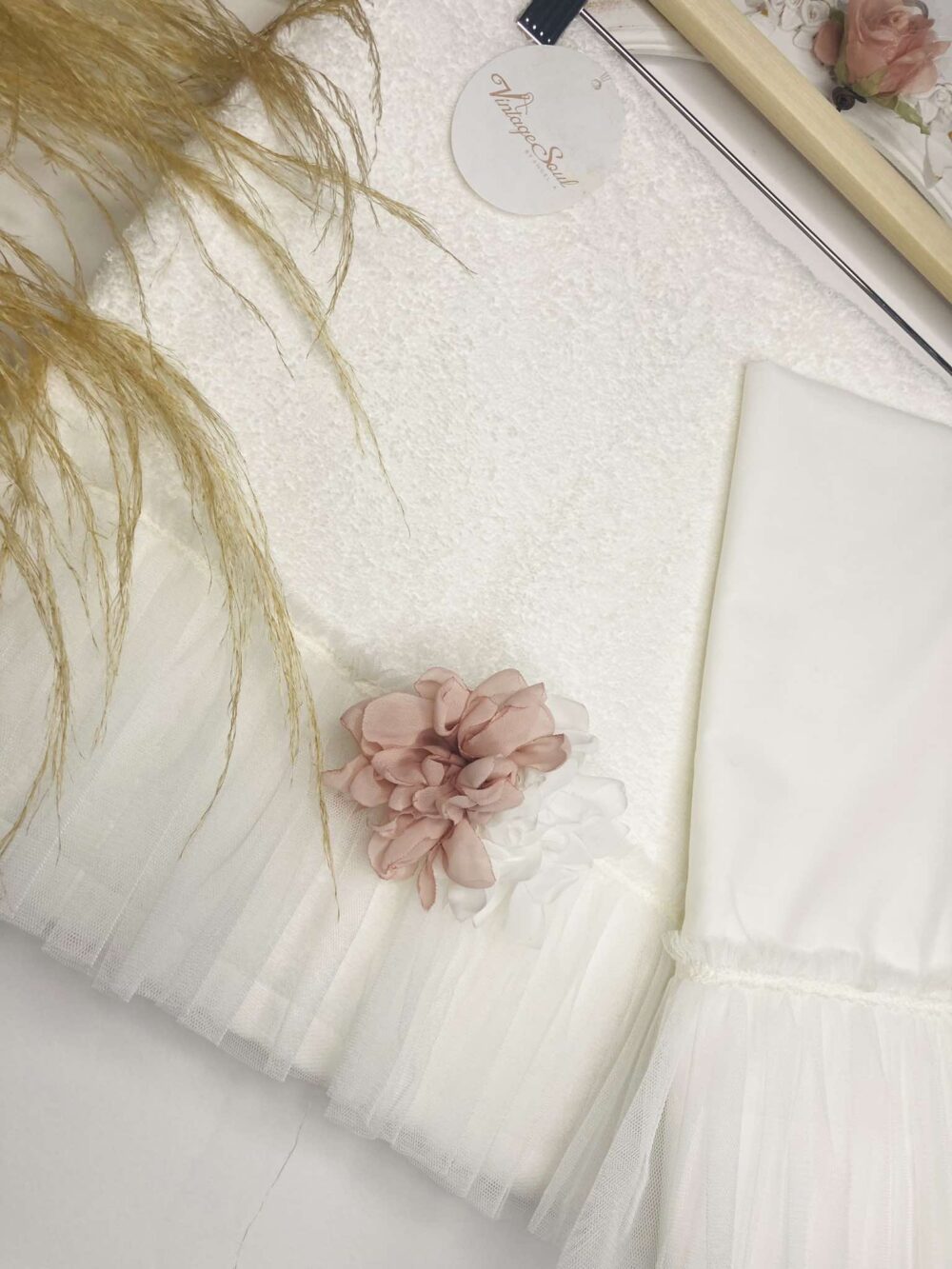 Χειροποίητα βαμβακερά λαδόπανα για κορίτσι με τούλι υπόλευκο με σούρα και λουλούδια στο χρώμα της πούδρας και ιβουάρ.