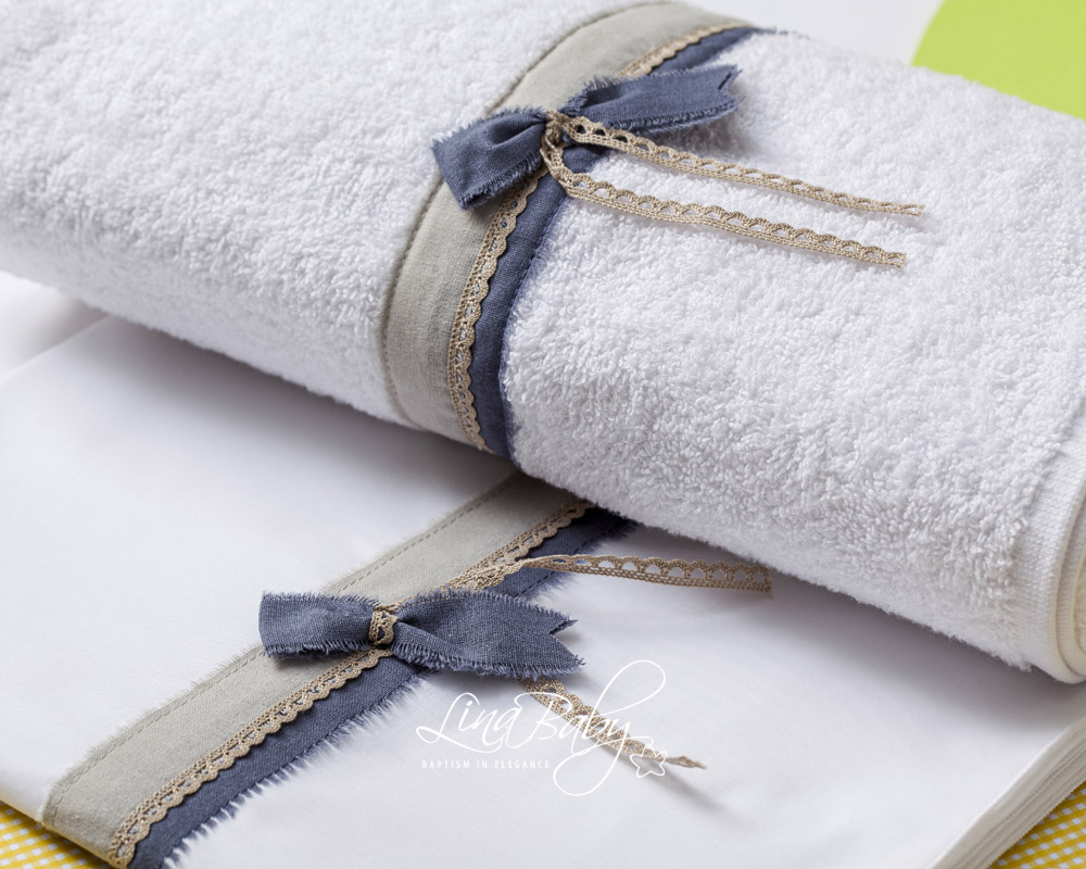 Το λευκό λαδόπανο συνδυάζεται με διακοσμητική τρέσα με ξέφτι Γκρί-μπλε και όμορφο φιογκάκι γραβατούλα σε μπλέ στην μέση.