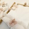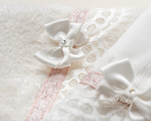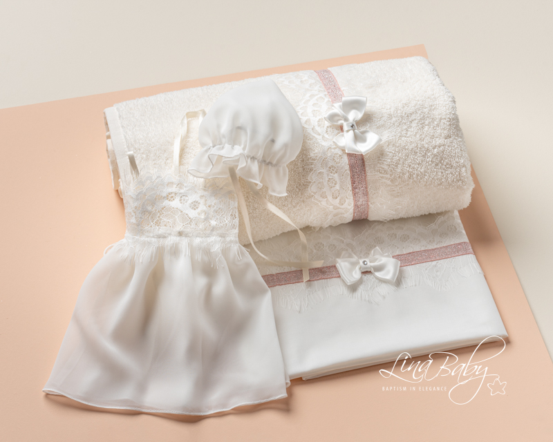 Ρομαντικό βαμβακερό σετ λαδόπανων σε Ιβουαρ χρώμα με Γαλλική δαντέλα chantilly, ροζ τρέσα με λούρεξ και χειροποίητο τριπλό σατέν φιογκάκι με στρας τύπου Swarovsky.