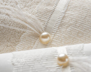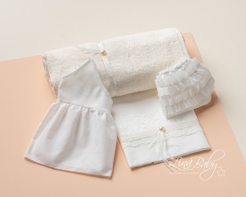 Ρομαντικό αλλά και τόσο κομψό βαμβακερό σετ λαδόπανων σε ιβουάρ χρώμα με μοναδική πλισέ δαντέλα Chantilly, σατέν κορδέλα, πέρλα και φτερό. Πετσέτα 70*140*400gr2.