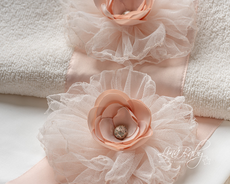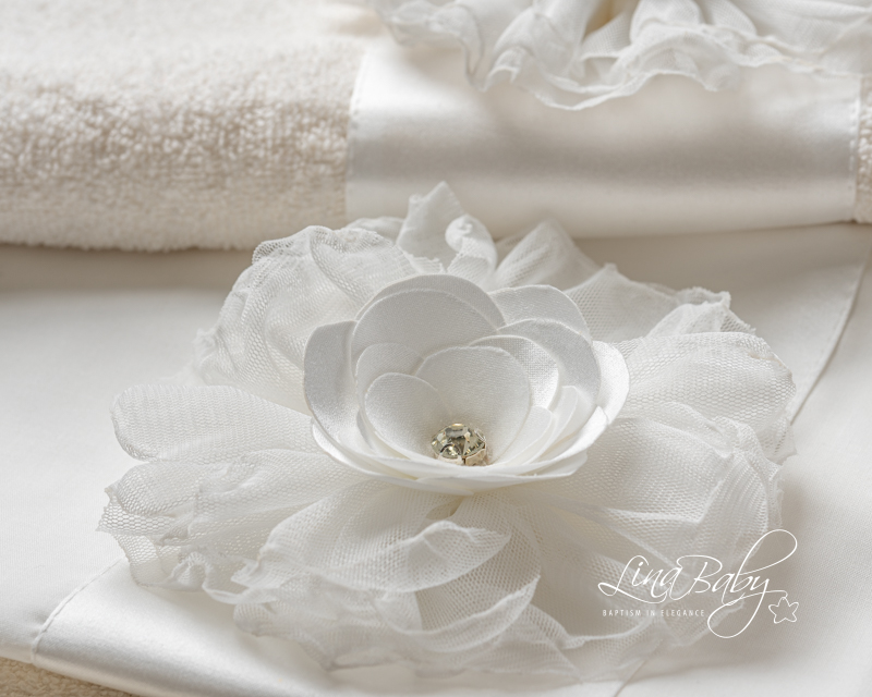 Φαρδιά φάσα από Duchess ύφασμα σε όλο το μήκος του λαδόπανου και χειροποίητο εντυπωσιακό λουλούδι στο κέντρο της φάσας απο τούλι, κομμένα πεταλάκια απο Duchess και στρας τύπου Swarovski.