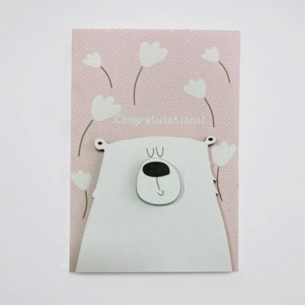 Χειροποίητη ευχετήρια κάρτα με ξύλινο αρκουδάκι λευκό σε ροζ φόντο.