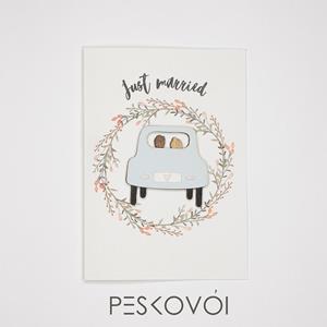 Χειροποίητη ευχετήρια κάρτα για γάμο με ξύλινο αμάξι
