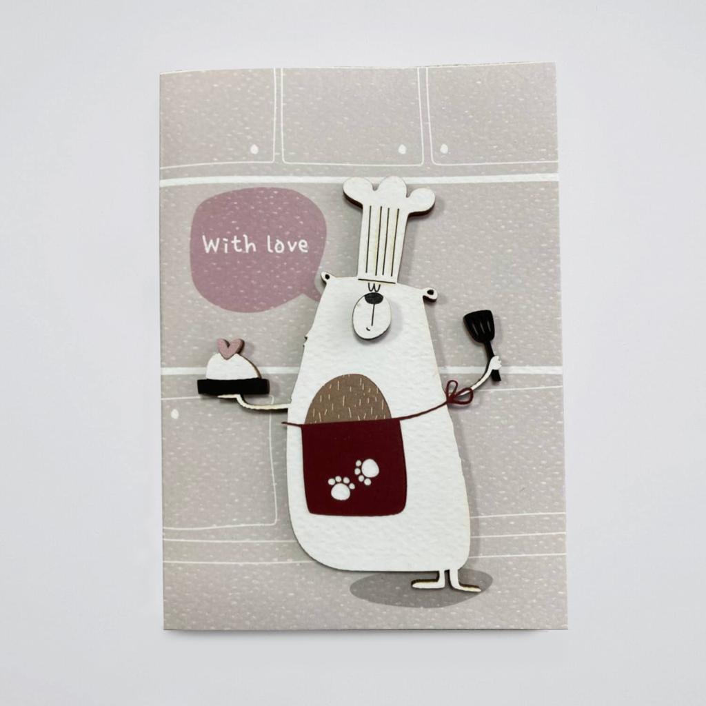 Χειροποίητη ευχετήρια κάρτα με αρκουδάκι και τούρτα.