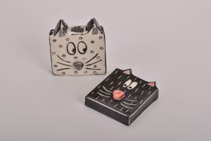 Χειροποίητη κεραμική διακοσμητική γατούλα σε λευκό και μαύρο χρώμα.