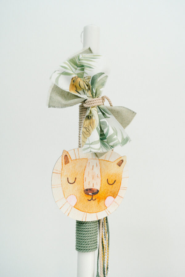Χειροποίητη λαμπάδα βάπτισης σε θέμα ζούγκλα με ξύλινο διακοσμητικό λιονταράκι σε αποχρώσεις μπεζ, λαδί.