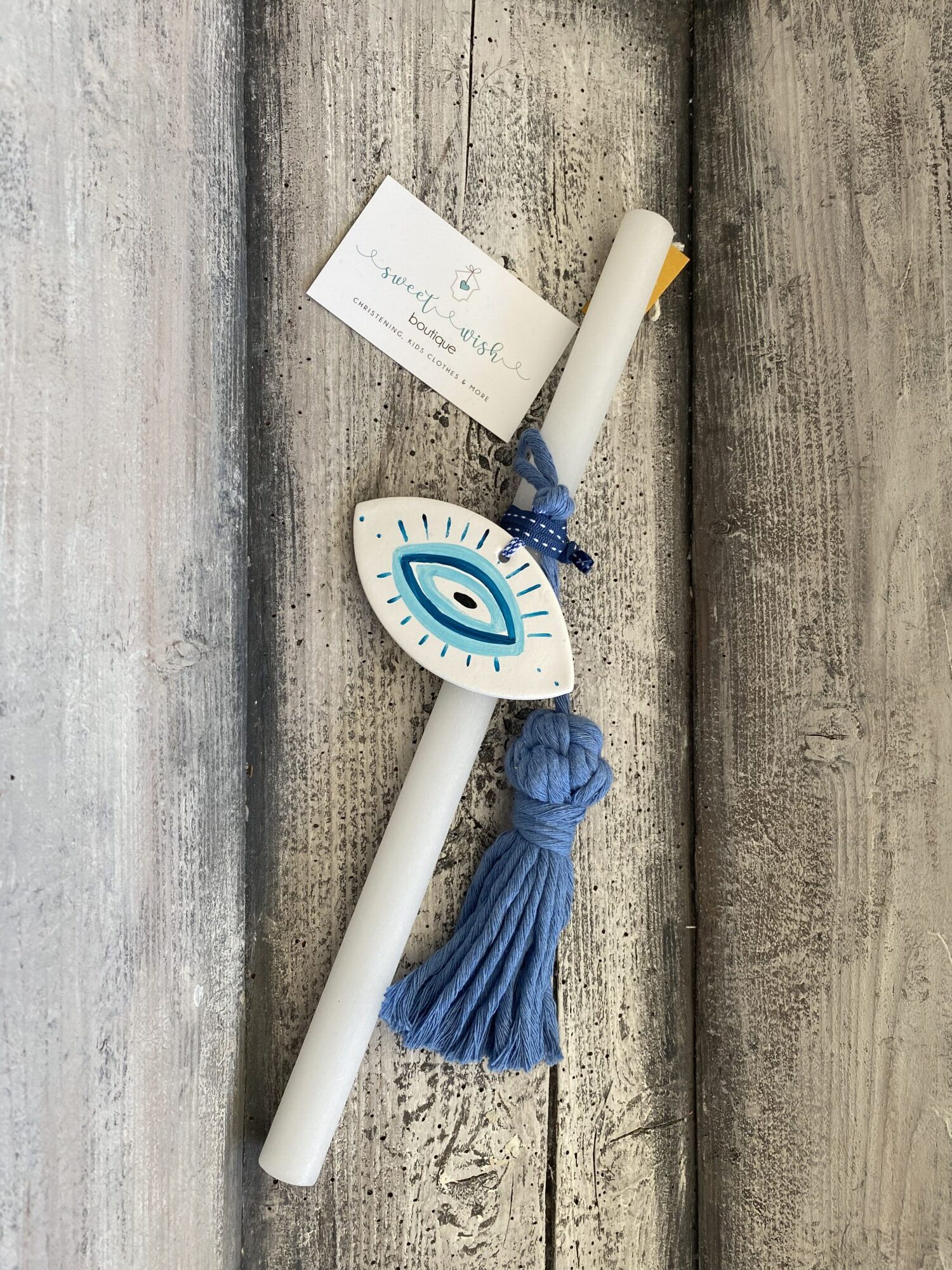 Χειροποίητη Πασχαλινή αρωματική λαμπάδα με ζωγραφισμένο πήλινο διακοσμητικό μάτι και υφασμάτινη φούντα.