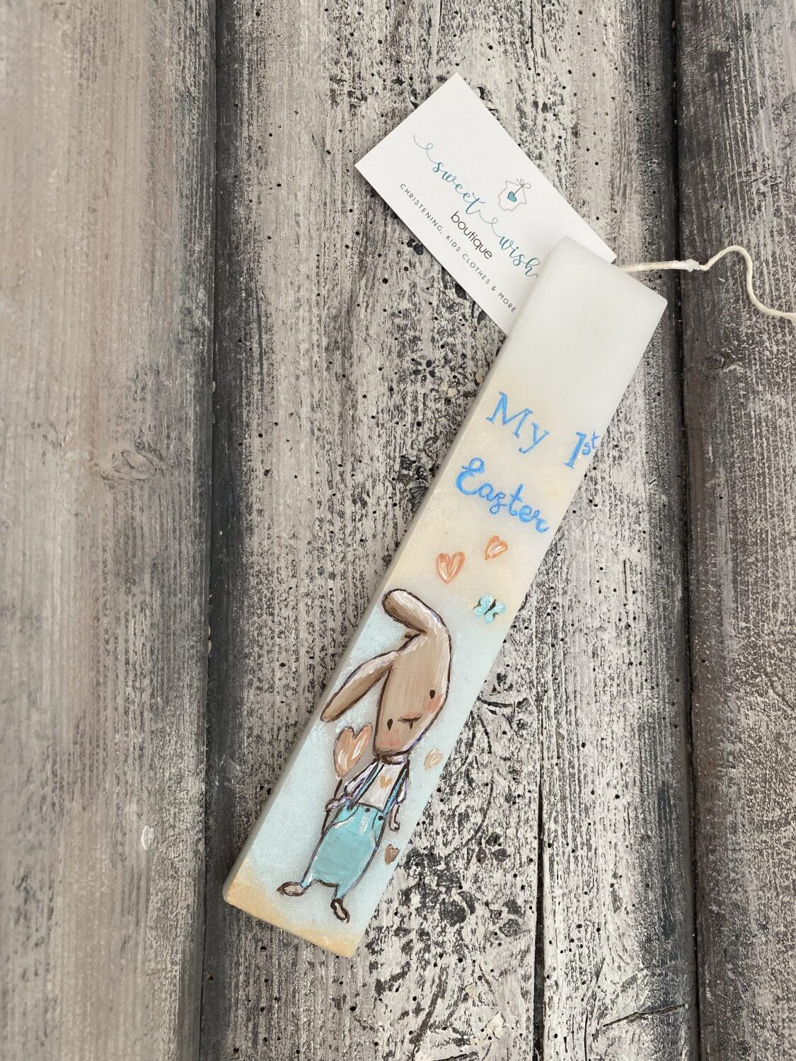 Χειροποίητη ζωγραφισμένη λαμπάδα Το πρώτο μου Πάσχα για αγόρι με κουνελάκι.