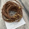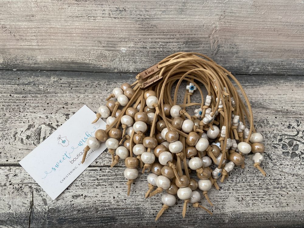 Χειροποίητο μαρτυρικό μπεγλέρι με σουέτ κορδόνι στο χρώμα της μόκας, με κεραμικό λευκό σταυρό και πέρλες σε γήινες αποχρώσεις.