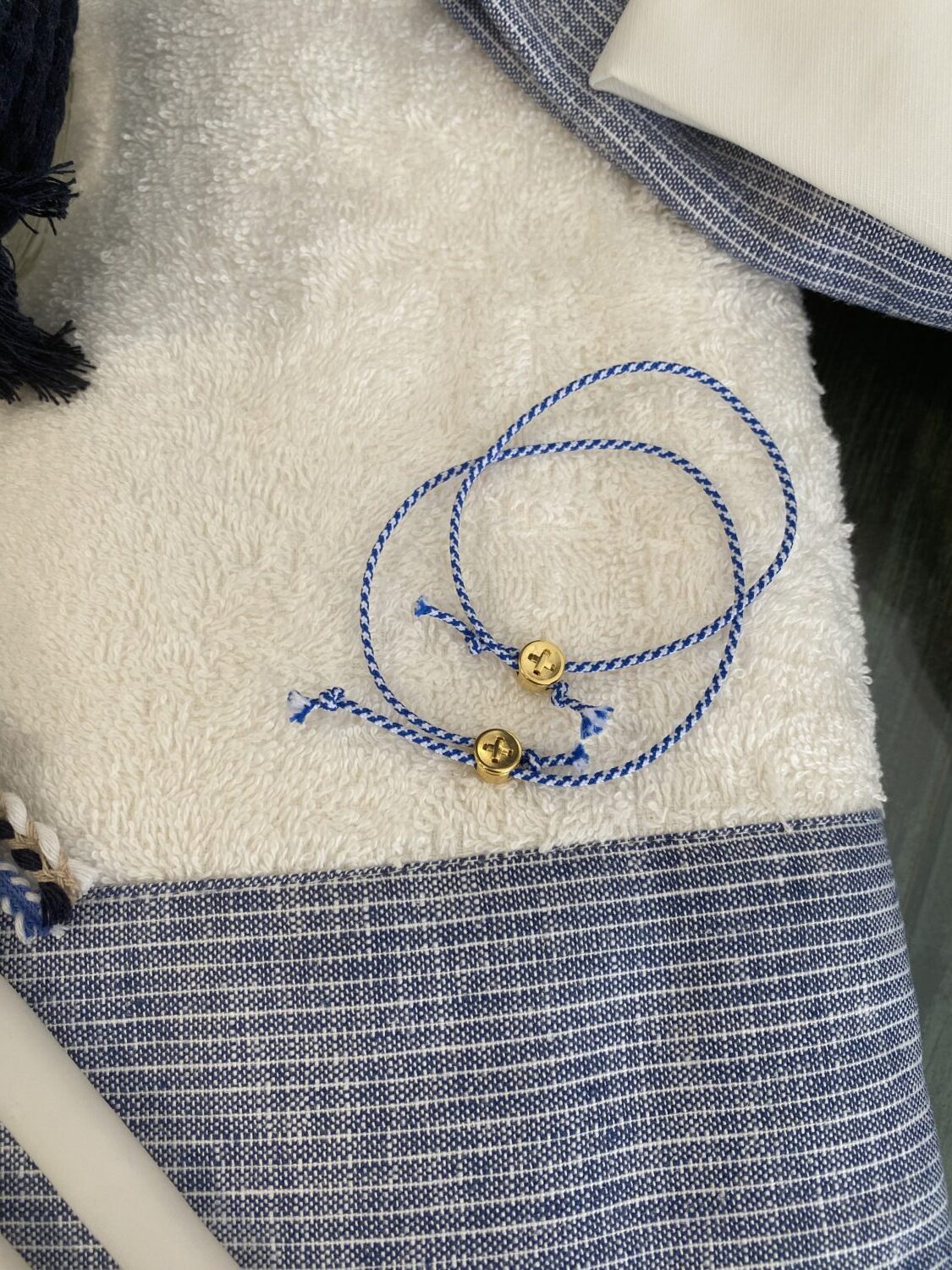 Χειροποίητο μαρτυρικό βάπτισης με μεταλλικό σταυρουδάκι και δίχρωμο βαμβακερό κορδόνι σε μπλε λευκό.