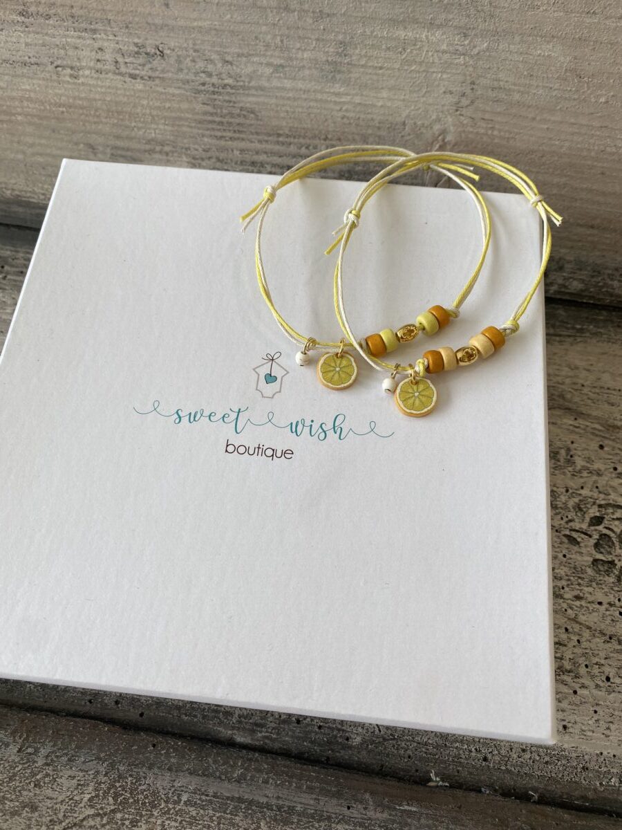Χειροποίητο μαρτυρικό βάπτισης βραχιολάκι με θέμα λεμόνι σε κίτρινο και ιβουάρ χρώμα με ακρυλικό λεμόνι, επίχρυσο σταυρουδάκι και κεραμικές χαντρούλες.