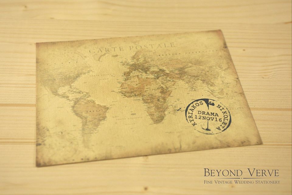 Χειροποίητο προσκλητήριο γάμου τύπου carte postale με παγκόσμιο χάρτη.