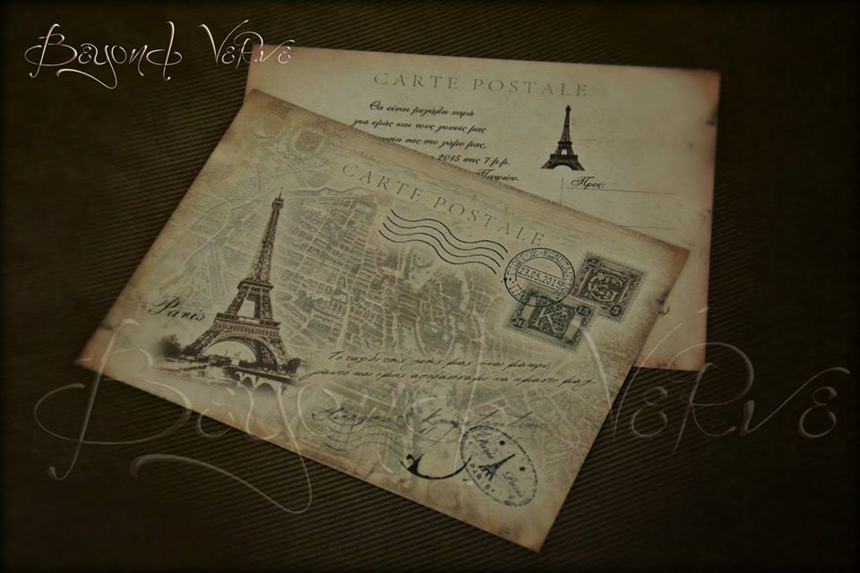Χειροποίητο προσκλητήριο γάμου “Ταξίδι στο Παρίσι” τύπου carte postale σε χαρτί 300 γρ.
