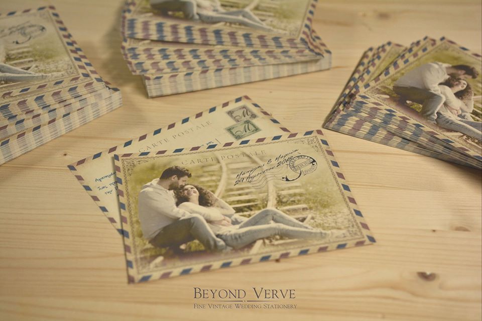 Χειροποίητο προσκλητήριο γάμου τύπου carte postale με την φωτογραφία του ζευγαριού και στο τελείωμα περιμετρικά παλιό γραμματόσημο.