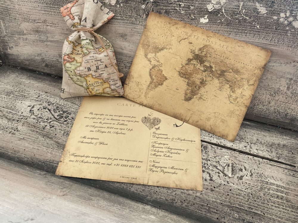 Χειροποίητο προσκλητήριο γάμου τύπου carte postale με παγκόσμιο χάρτη.