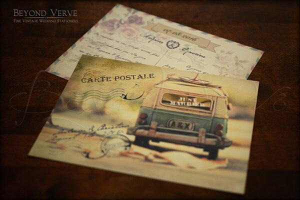 Χειροποίητο προσκλητήριο γάμου τύπου carte postale με vw van διπλής όψης σε χαρτί 300γρ.