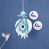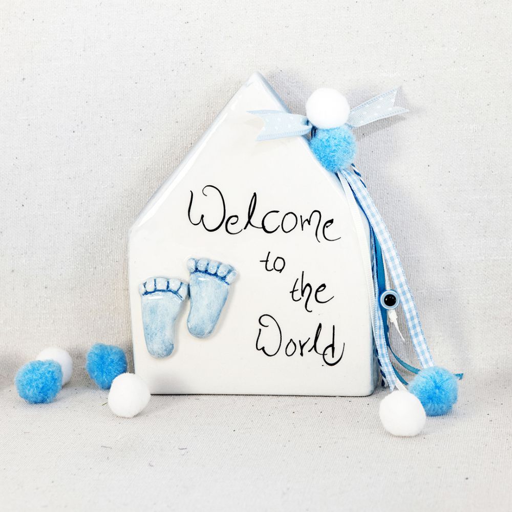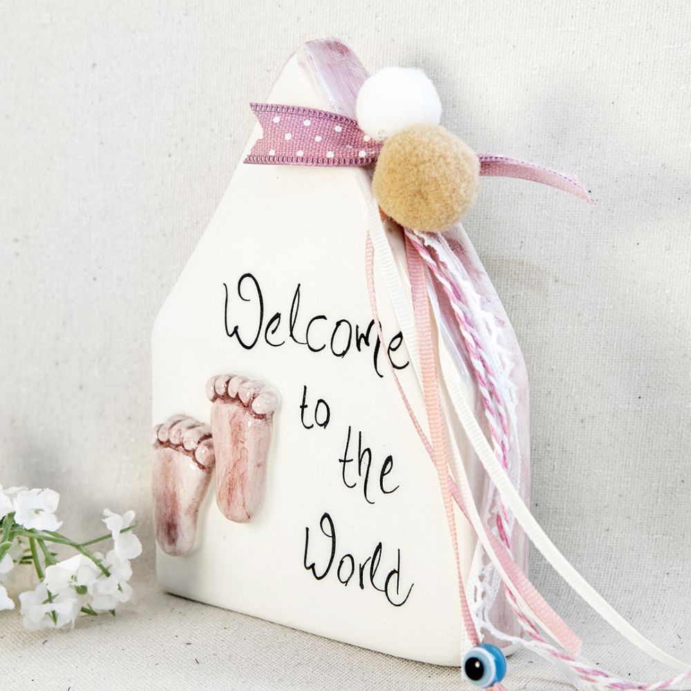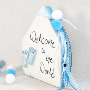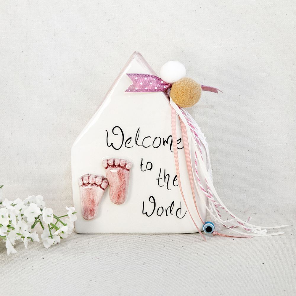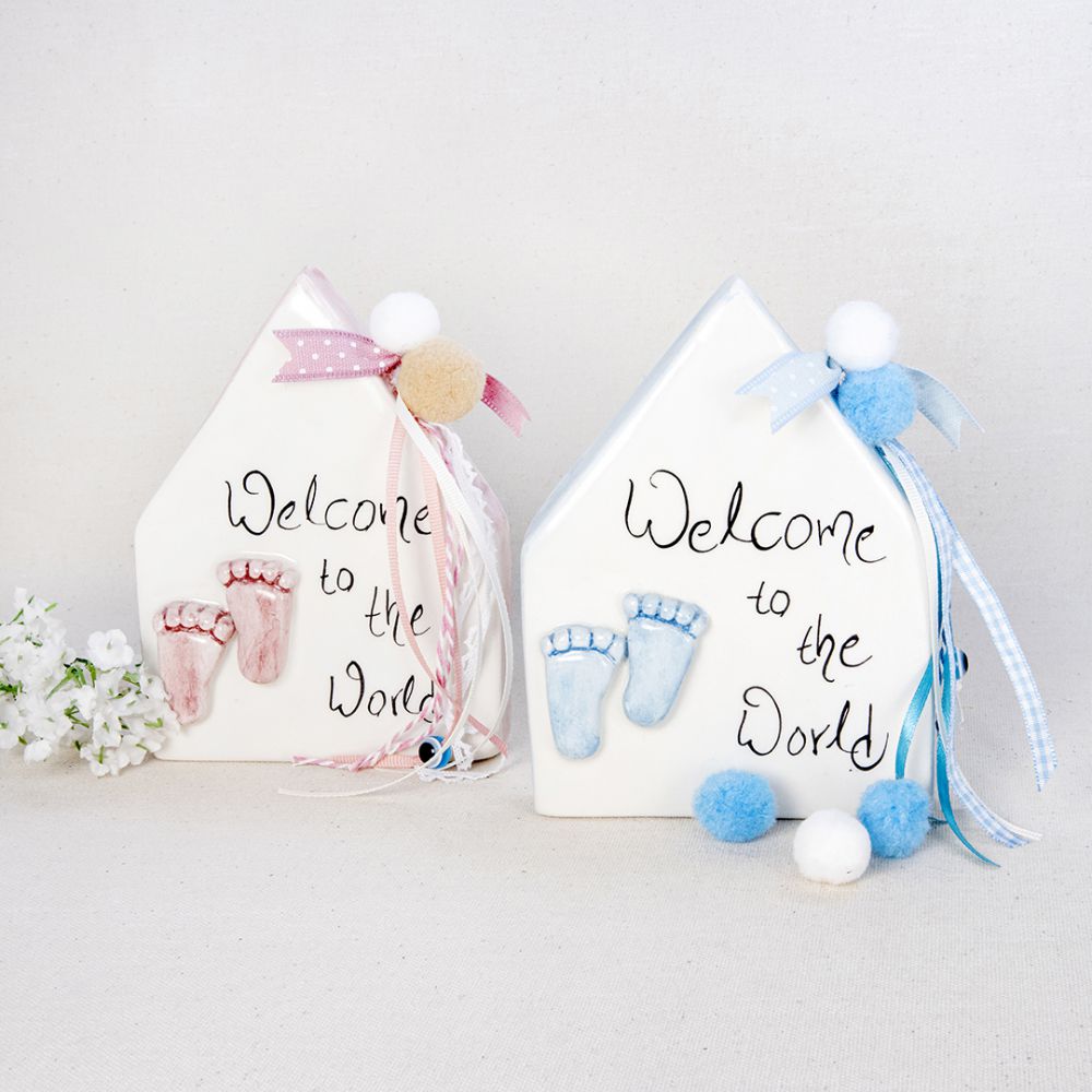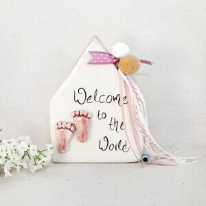 Χειροποίητο κεραμικό τρισδιάστατο σπιτάκι με ανάγλυφες παιδικές πατουσίτσες σε απαλό ροζ ή γαλάζιο χρώμα, διακοσμημένο με κορδέλες, pom pon, πούπουλα και ματάκι.
