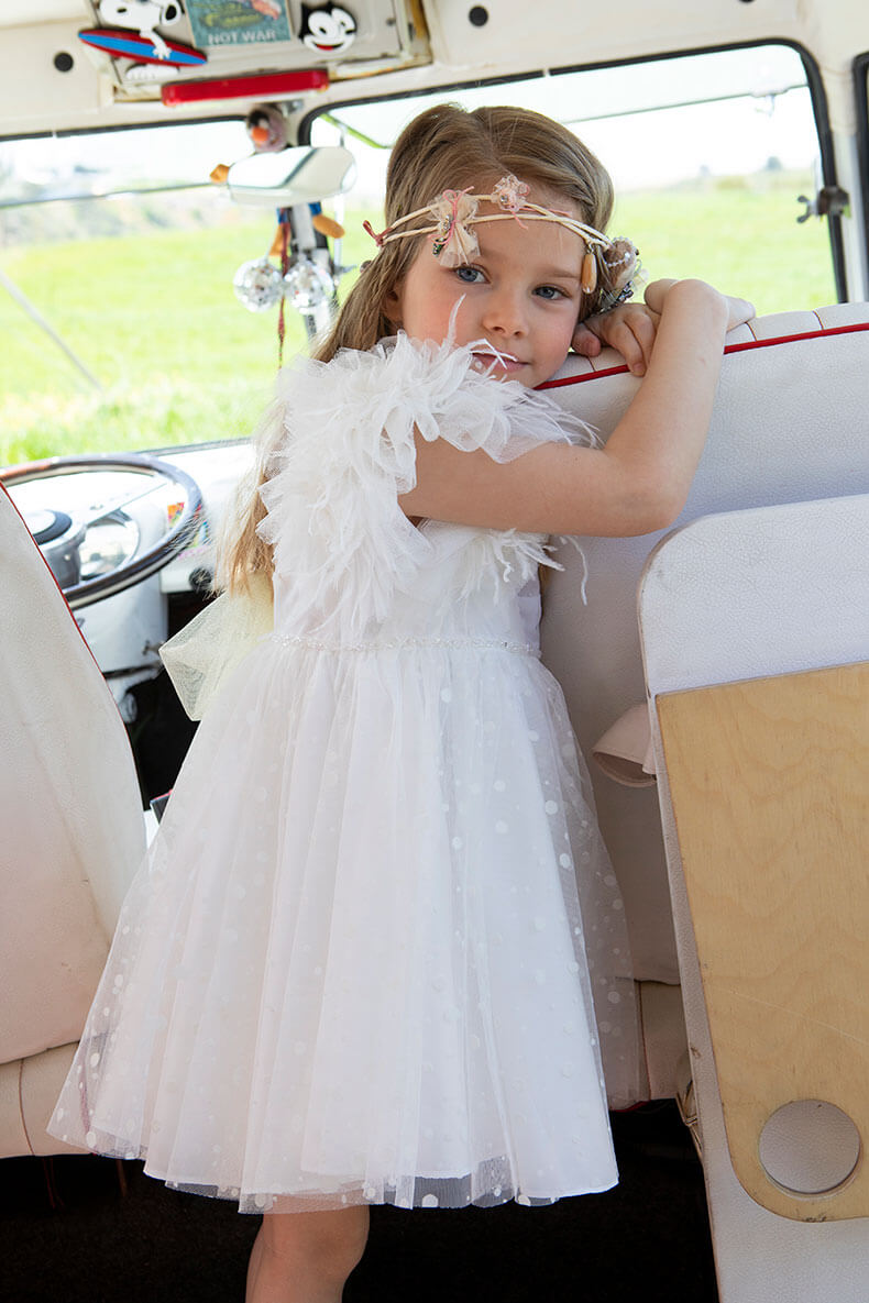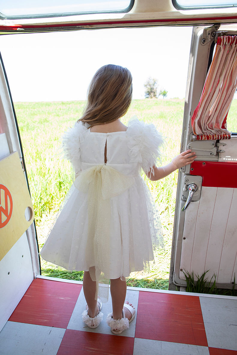Η Poliniki είναι ένα ανάλαφρο εντυπωσιακό φόρεμα από εξαιρετικής ποιότητας εκρού πουά τούλι με ιδιαίτερα βολάν για μανίκια που κάνουν το ρούχο ανεπανάληπτο.