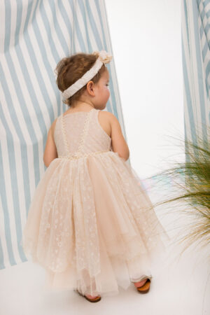 Nude φόρεμα με layering φύλλων από εκρού και nude τούλι με κεντημένη δαντέλα με μαργαρίτες και ιριδίζον χρυσή πλέξη για λάμψη. Ημιδιάφανο μπούστο με V σχέδιο στολισμένο από μοτίφ λουλουδιών από οργάντζα και μικρές πέρλες.