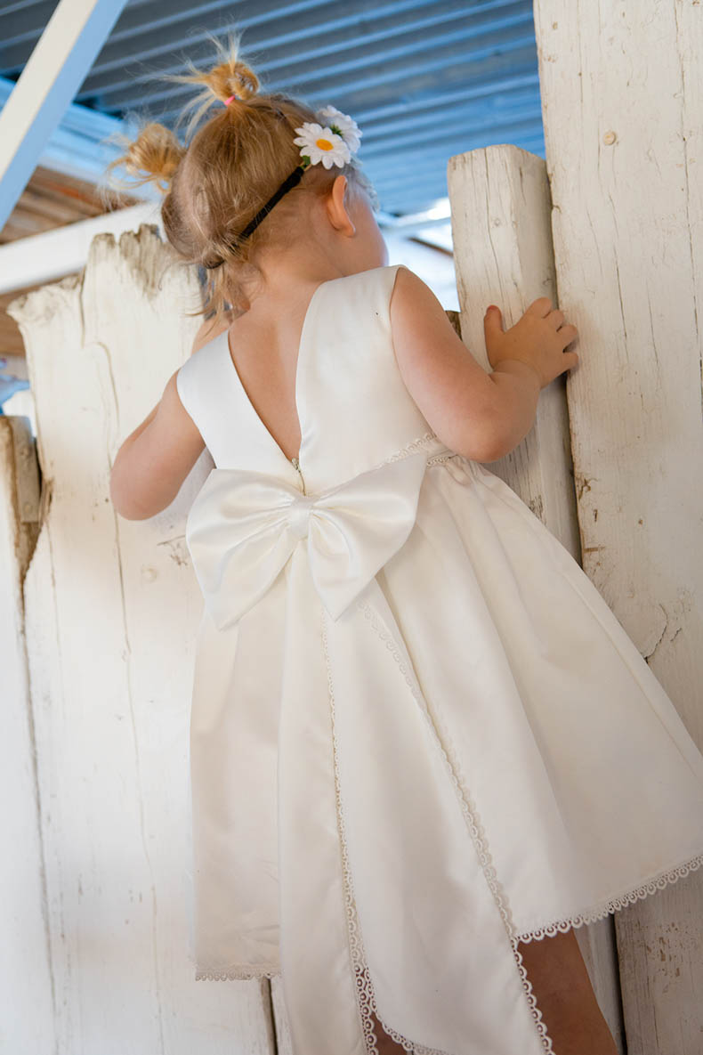 Η Zenia είναι ένα εκρού αμάνικο σατέν φόρεμα βάπτισης με ανοιχτή πλάτη.