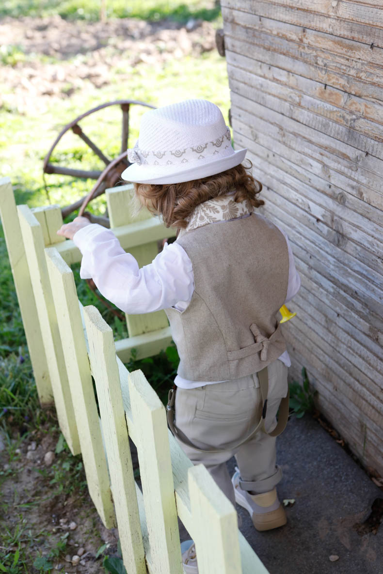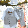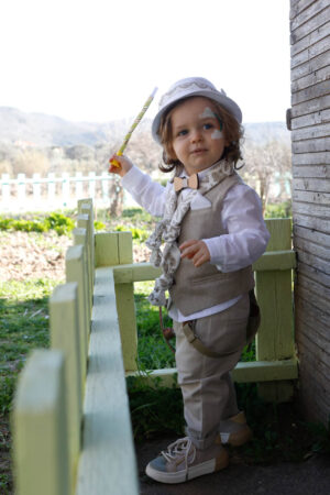 Ο Xristos είναι το απόλυτο μπεζ καφέ κοστούμι που θα αγαπήσετε. Γιλέκο από βαμβακερή ψάθα Ιταλίας. Πουκάμισο λευκό 100% cotton. Παντελόνι μπεζ alternative καπαρντίνα με μπεζ τιράντες. Φουλάρι διπλό από 100% cotton εκρού και ύφασμα με printed pattern. Αξεσουάρ το ξύλινο παπιόν και το λευκό ψαθάκι με μπεζ pattern τρέσσα.