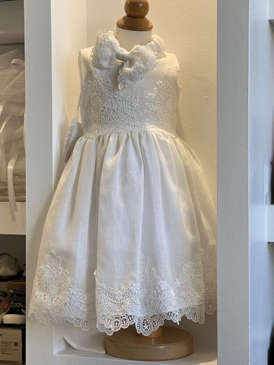 Χειροποίητο βαπτιστικό βαμβακερό φορεματάκι sugar and spice με λεπτομέρειες από κιπούρ δαντέλα.