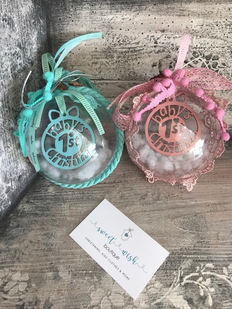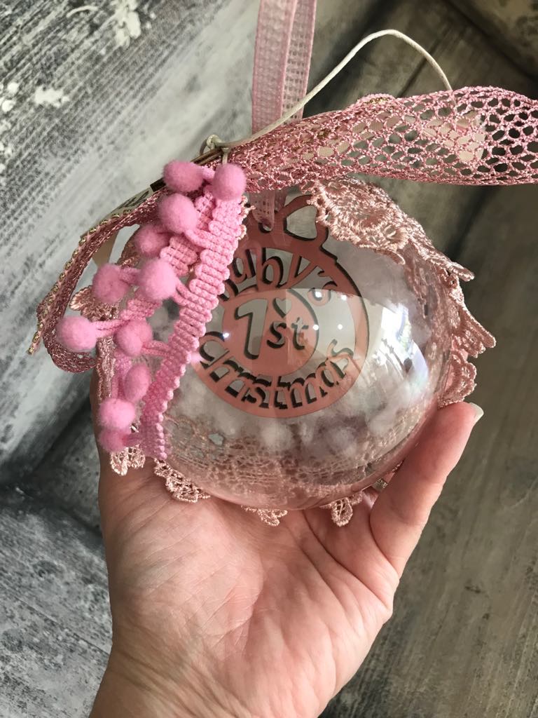 Η μπάλα είναι από plexiglass με ξύλινο διακοσμητικό my first Christmas σε αποχρώσεις του ροζ.