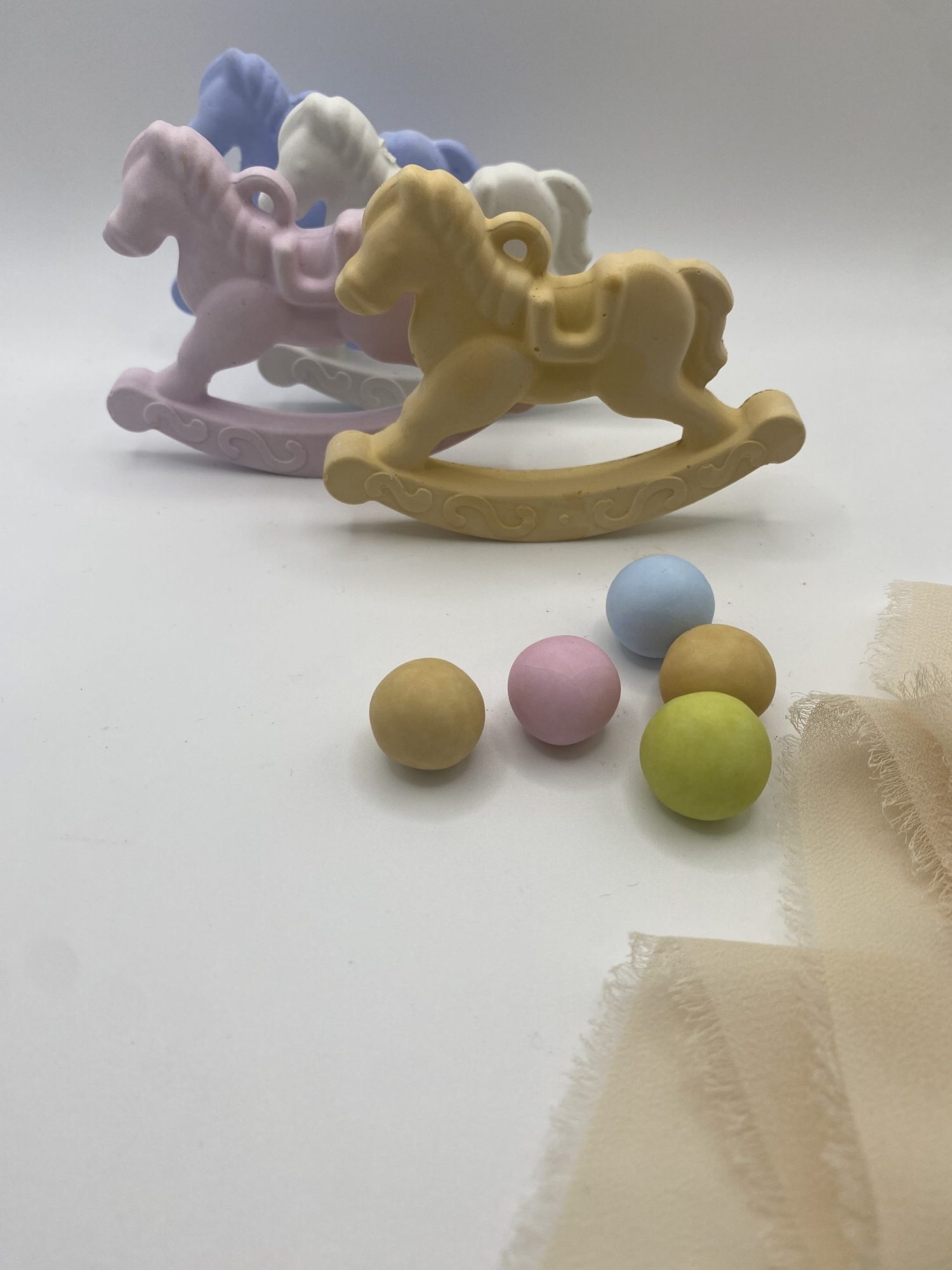 Το κρεμαστό αλογάκι – σύμβολο παιδικής αθωότητας και χαράς – είναι φτιαγμένο από πορσελάνη και μπορείτε να το στολίσετε με κορδέλες οργάντζας και ότι άλλο επιθυμείτε σε αποχρώσεις σιέλ, ροζ, λευκό, κίτρινο.
